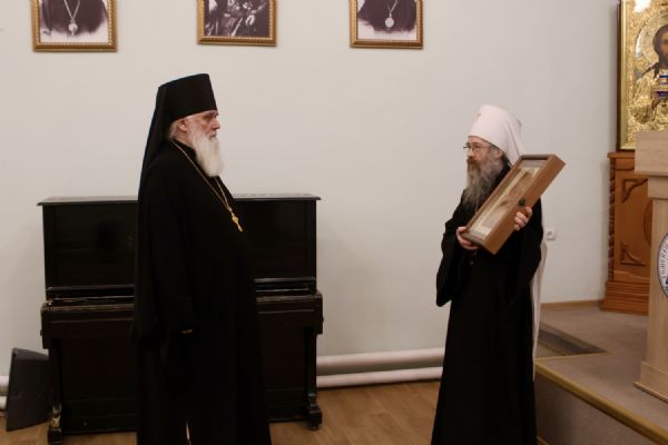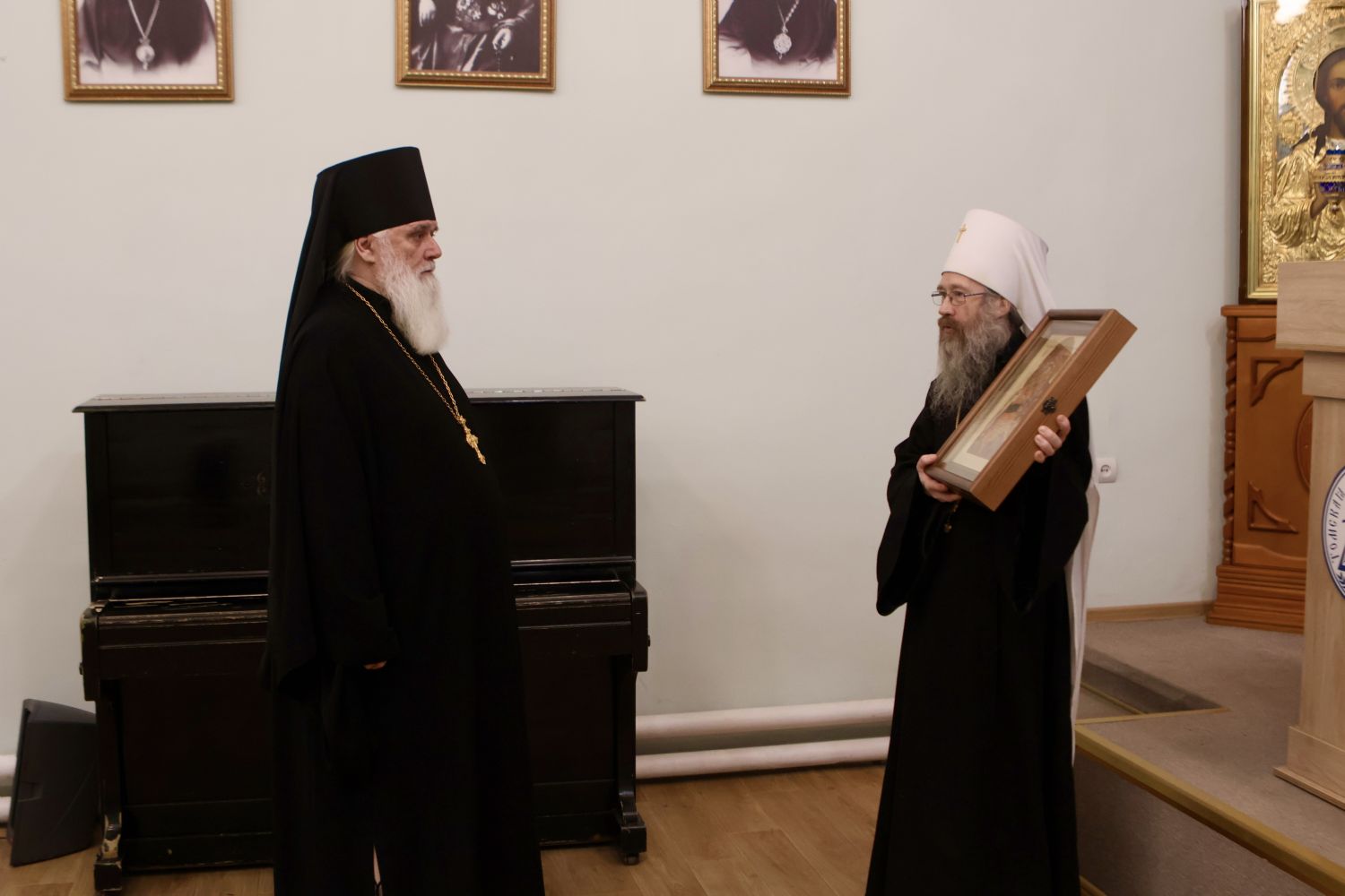 Митрополит Ростислав поздравил ректора семинарии архимандрита Иосифа с 60-летним юбилеем и подарил икону Пресвятой Богородицы "Достойно есть" (Милующая).