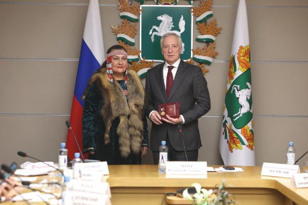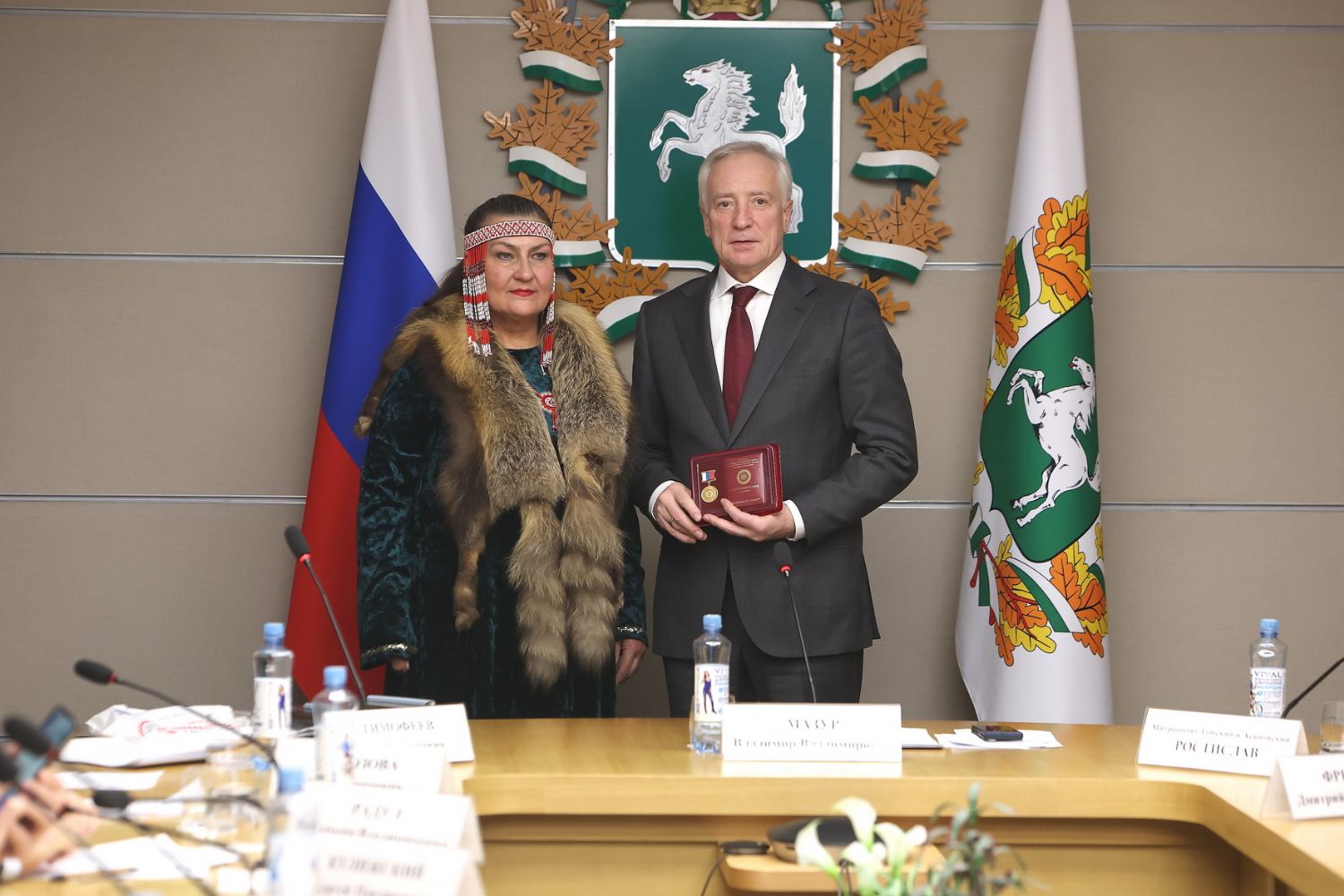 Президент ассоциации коренных малочисленных народов Севера Томской области «Колта-куп» («Обской человек») Тамара Усатова вручила Владимиру Мазуру медаль «За верность Северу».