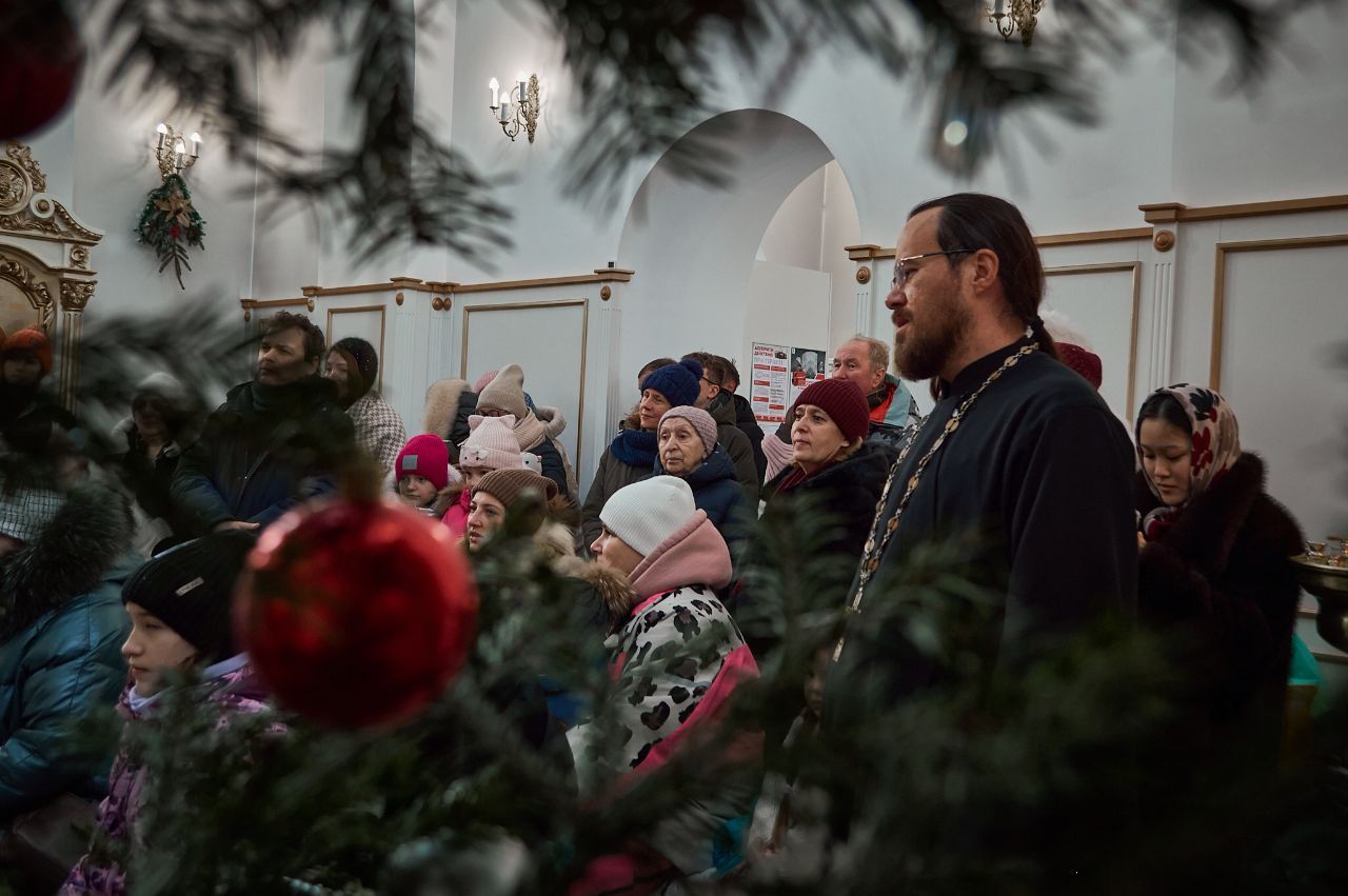 Гости подпевали колядки вместе с певчими Мужского хора, настоятелем храма иереем Евгением Растяпиным, настоятелем Воскресенской церкви иереем Дионисием Мелентьевым и настоятелем Покровской церкви с. Петухово иереем Сергием Шитиковым.