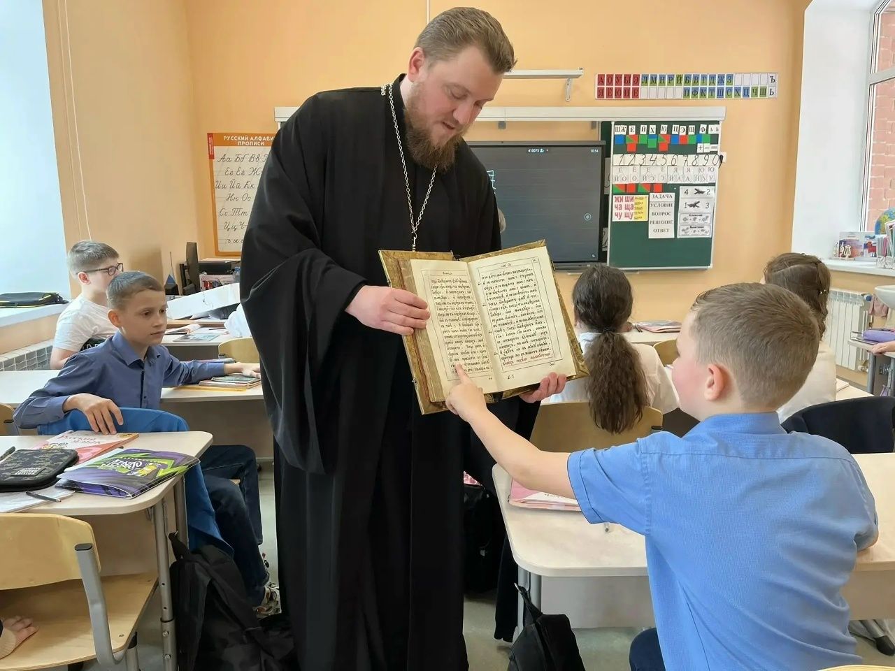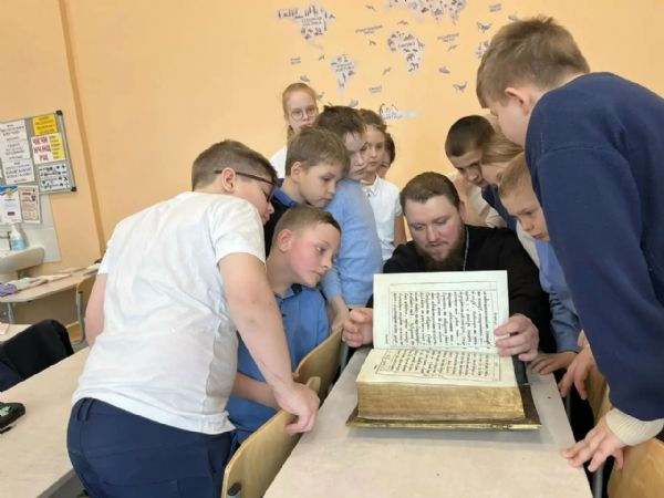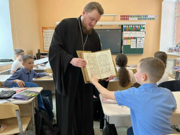 Священник рассказал учащимся 3 "А" и 3 "Г" классов МАОУ Гимназия №26 а также 2 "А" и 4"А" СОШ №5 об истории православной книги и проиллюстрировал рассказ демонстрацией старинных изданий. Батюшка привез с собой раритетные книги начала XIX века, ребята с интересом листали и рассматривали страницы — воплощенную историю нашей родной страны.