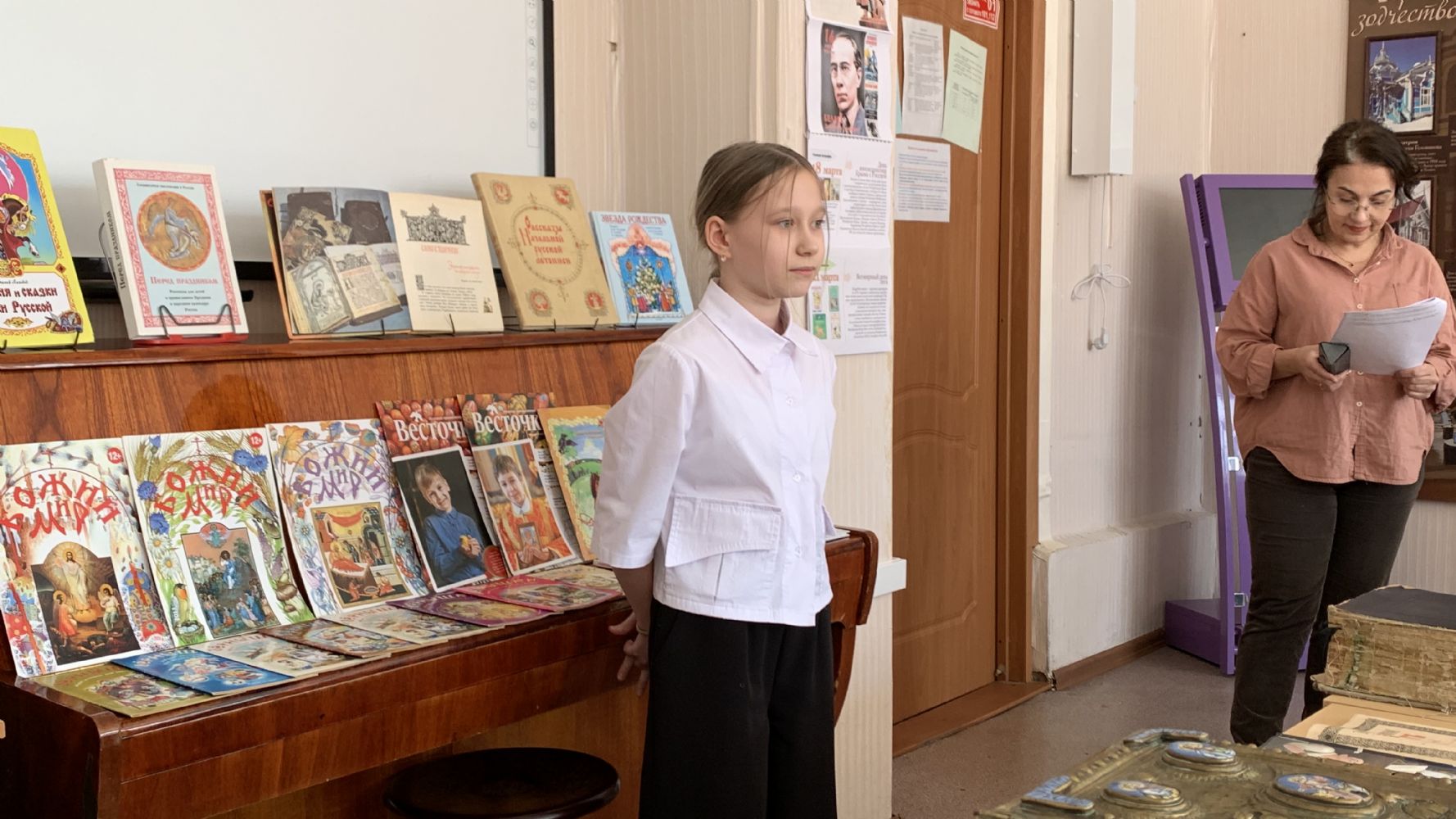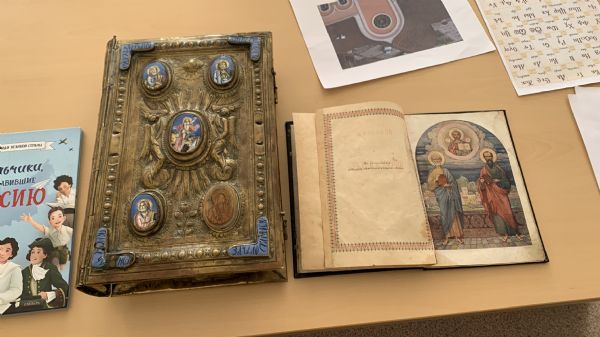Особый интерес ребят вызвало Евангелие, изданное в 18 веке, в тяжелом окладе, украшенном металлическими накладками с изображением святых. Ребята полистали книги, рассмотрели буквицу, особенности шрифта и систему сокращения слов в богослужебных книгах, написанных на церковнославянском языке.