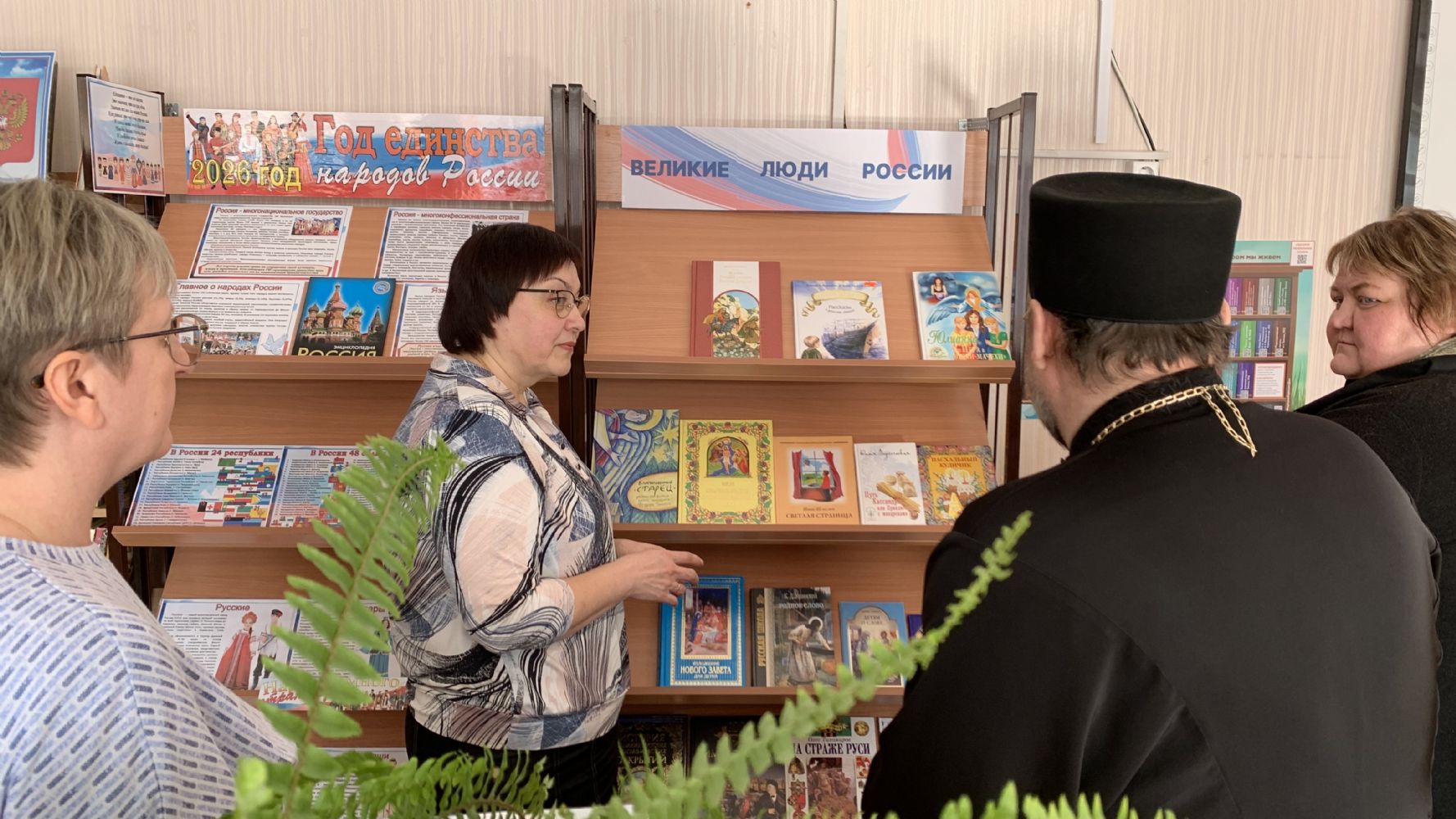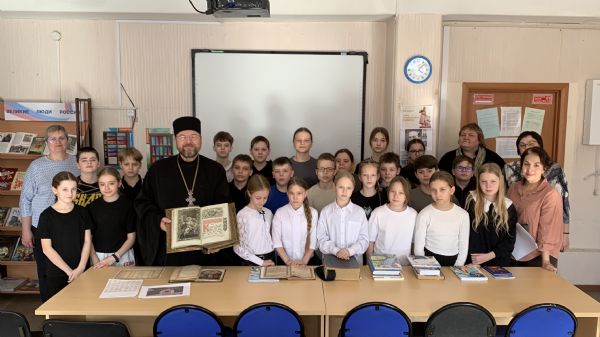 Во время посещения гимназии отец Святослав совместно с педагогами провел библиотечный урок, открыл школьную выставку православных книг. На выставке представлены книги из библиотечного фонда этого учебного заведения общего среднего образования с углублённым изучением предметов гуманитарного цикла, а также книги Свято-Троицкого храма.