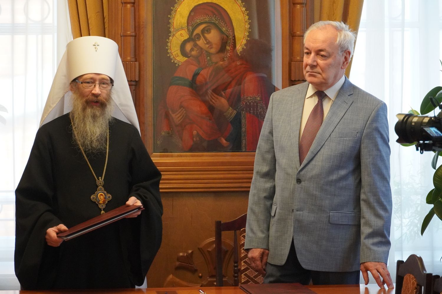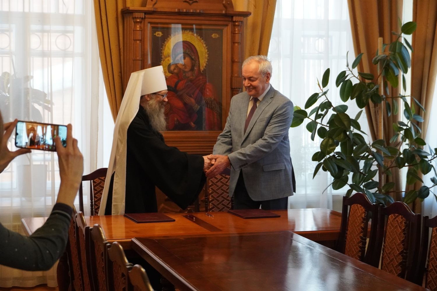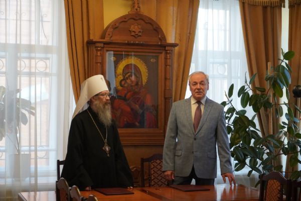 После подписания соглашения митрополит Томский и Асиновский Ростислав и начальник Департамента лицензирования и регионального государственного контроля Томской области Александр Николаевич Деев обсудили планы дальнейшей совместной работы.