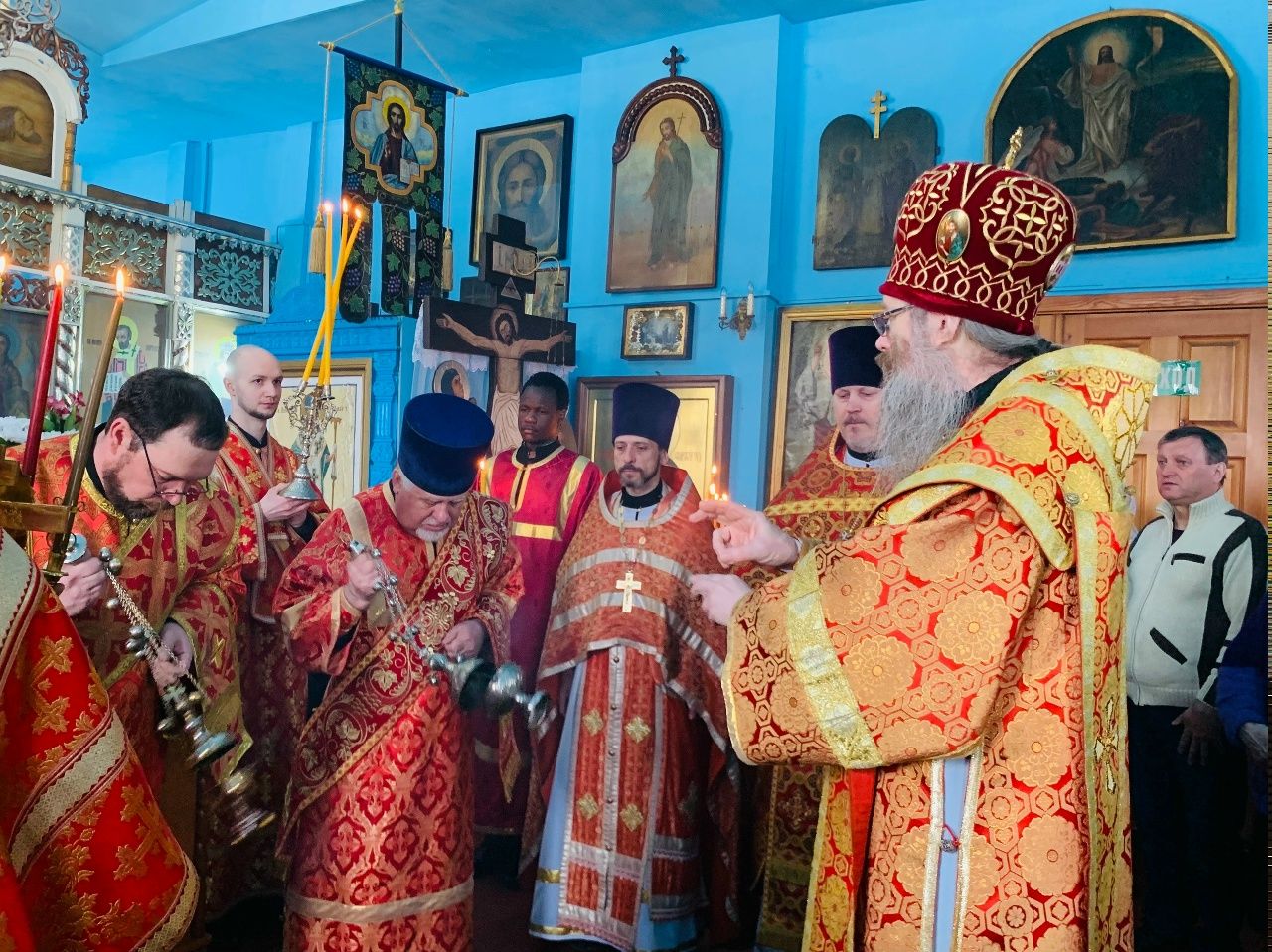 Его Высокопреосвященству сослужили настоятель Покровского храма г. Асино протоиерей Александр Никулин, ключарь Петропавловского собора г. Томска иерей Олег Огнёв и штатный священник Покровского храма г. Асино иерей Павел Волковский.