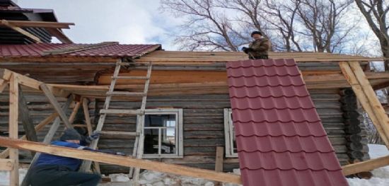 На первом этапе была очищена от снега крыша здания, и снят старый оцинкованный металлопрофиль. Затем была приготовлена обрешётка из тёса. Далее уложены листы металлочерепицы. Наконец, прикручены ветровые и отливные планки, а также коньки. Работы выполнялись сначала на южной стороне здания, затем — на северной. 20 марта крыша была полностью перекрыта.