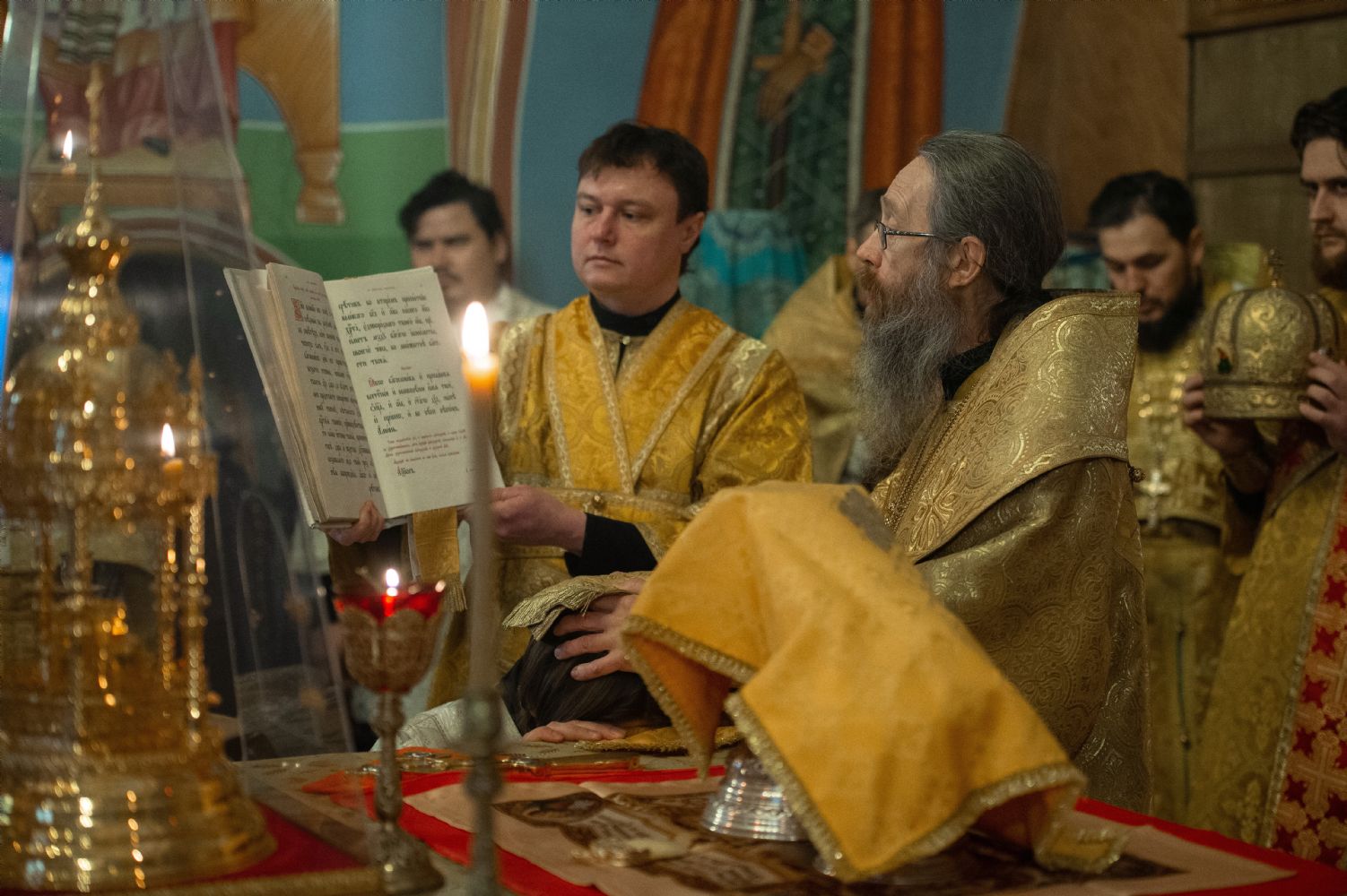 За Литургией были совершены хиротония (рукоположение) диакона Воскресенской церкви г. Томска Георгия (Юрия) Козорезова в сан священника и хиротония пономаря Никольского женского монастыря пос. Могочино Молчановского района иподиакона Александра Цоя – в сан диакона.