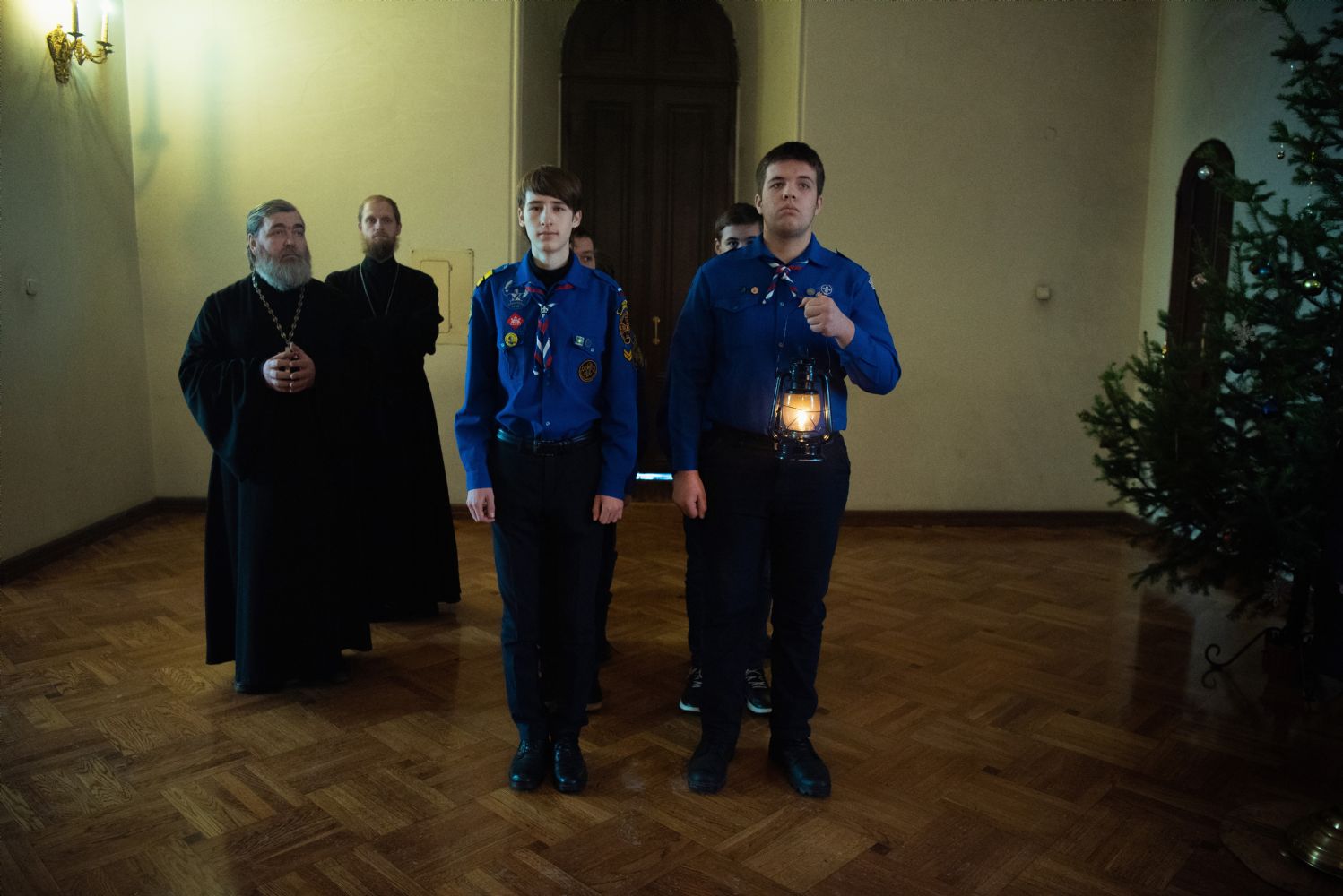 От лампады с Вифлеемским огнем архипастырь возжег праздничную свечу, от которой верующие смогли зажечь затем свои свечи как символ великого праздника и продолжение духовных традиций Святой Земли.