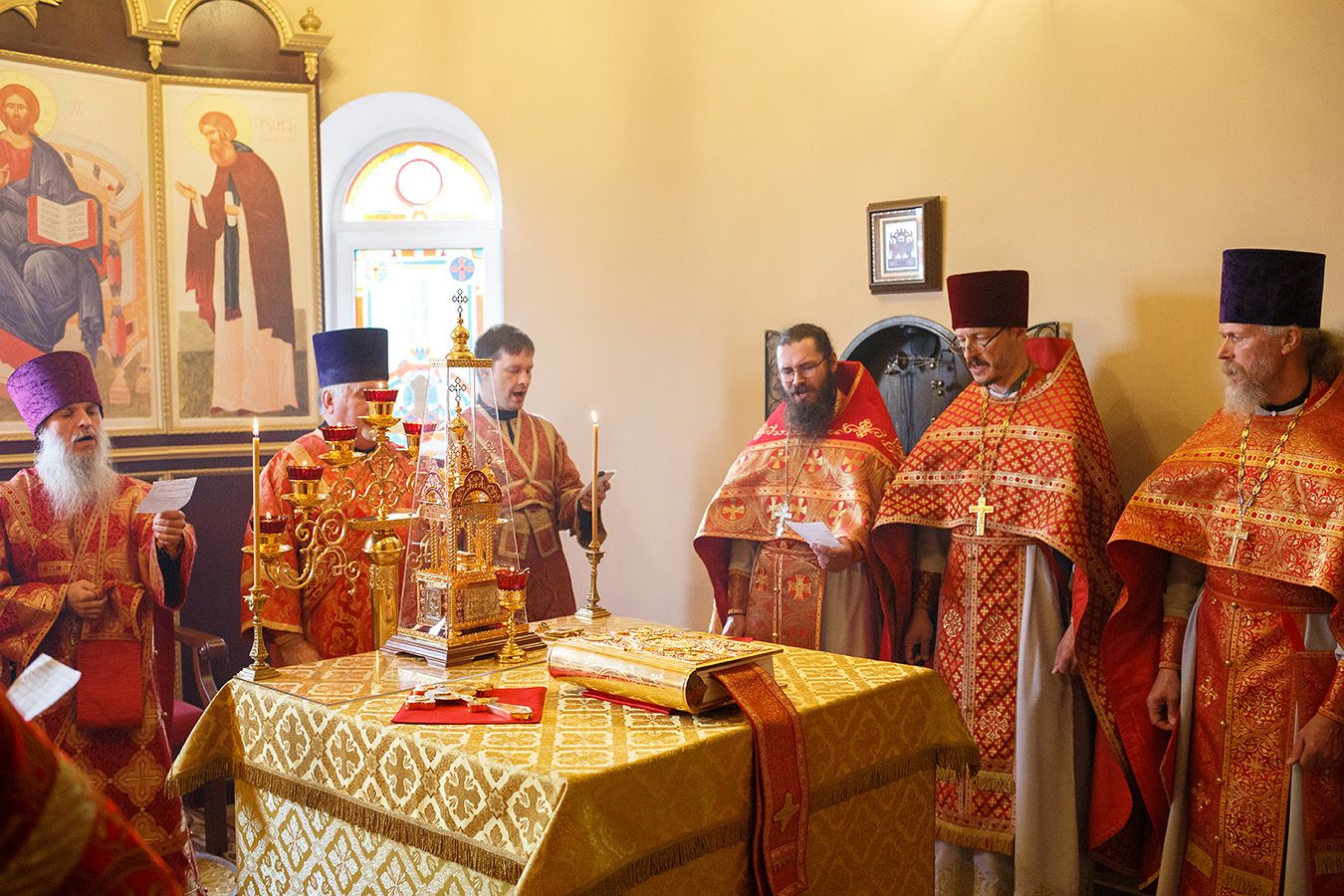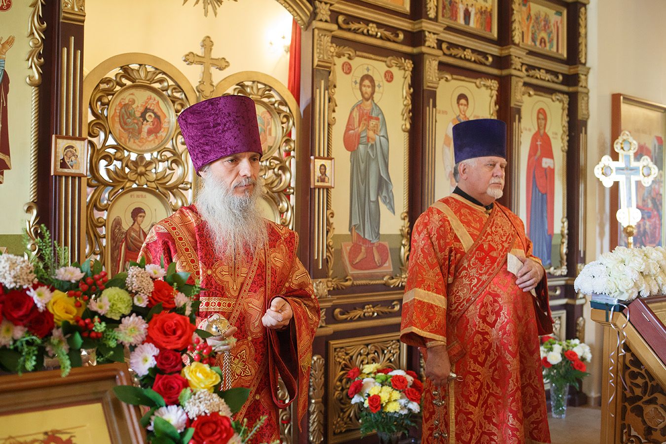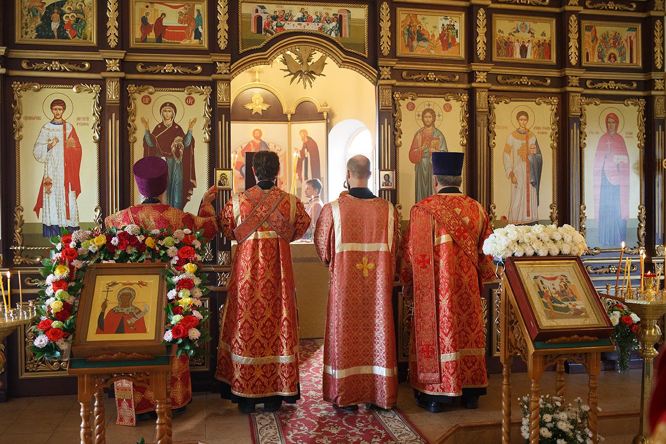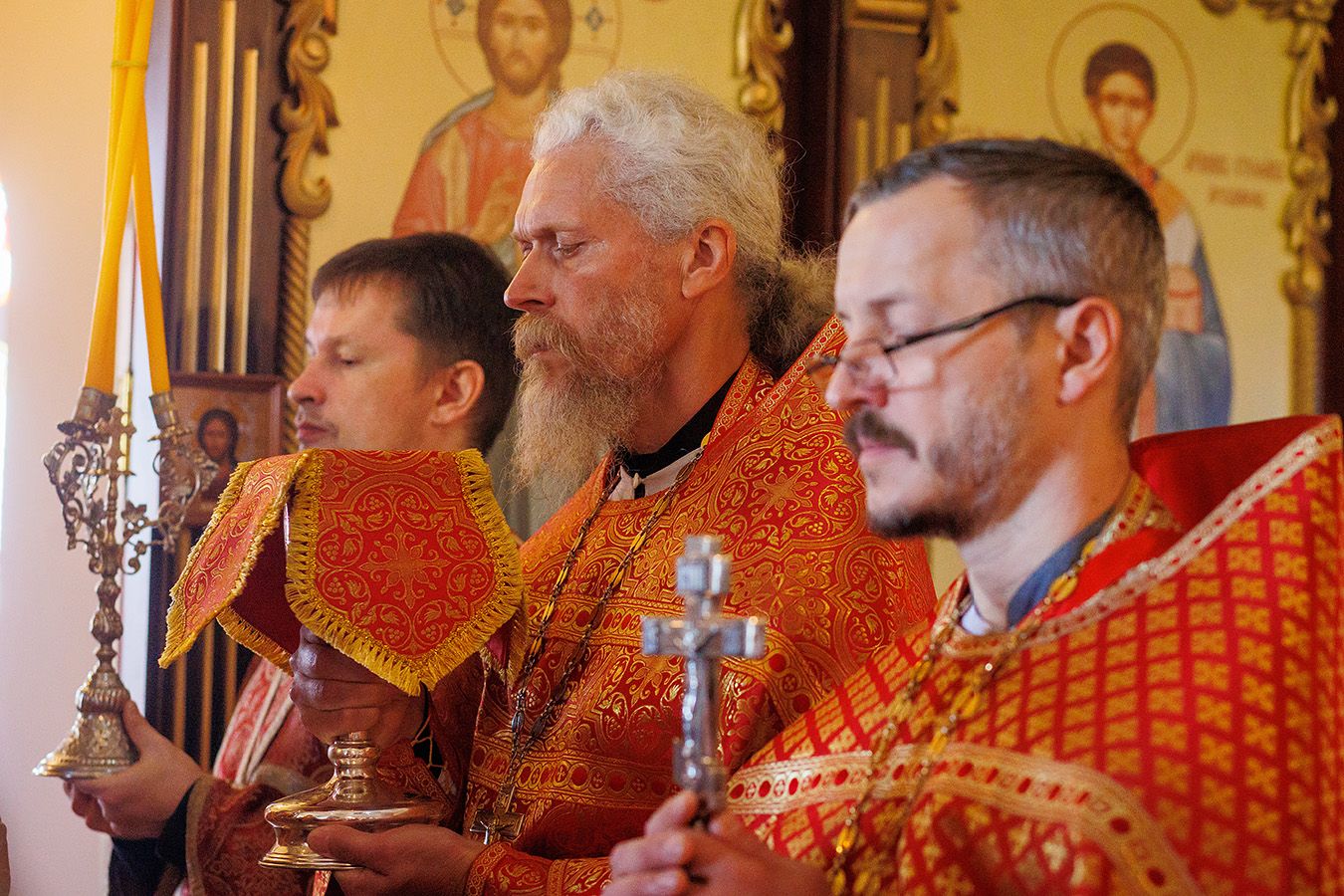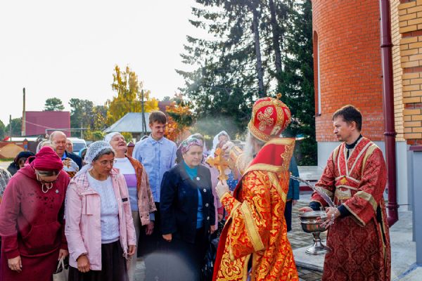 Главе Томской митрополии сослужил настоятель храма в с. Богашево протоиерей Михаил Фаст, настоятель храма св.блгв.кн. Александра Невского протоиерей Сергий Никаноров, настоятель храма апостола Иоанна Богослова в Академгородке иерей Дионисий Землянов, настоятель храма Воздвижения Креста Господня в п. Светлый иерей Владислав Холстинин и настоятель Успенской церкви в д. Лоскутово иерей Иаков Фаст. Диаконский чин представили протодиакон Владимир Марков, протодиакон Роман Штаудингер и диакон Димитрий Чабан. В завершении Литургии был совершен Крестный ход вокруг храма.