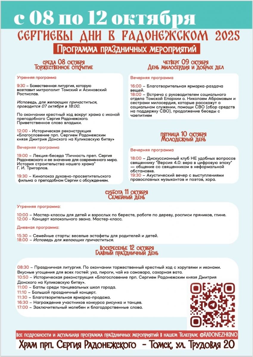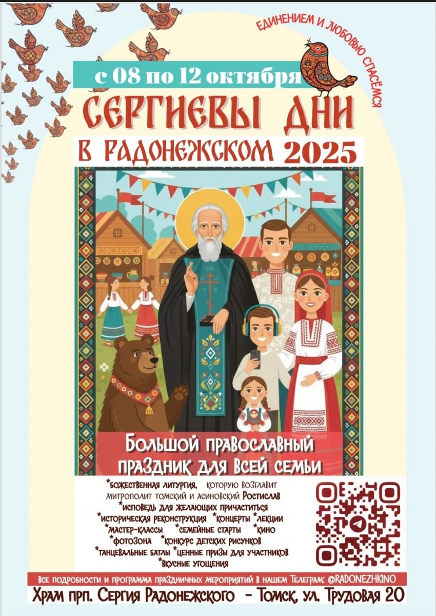 8-12 октября по благословению митрополита Томского и Асиновского в мкр-не Радонежский пройдут Сергиевы дни, посвященные дню памяти преподобного Сергия Радонежского.