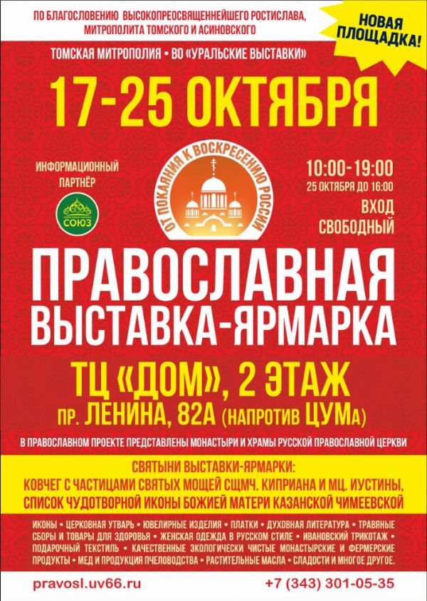 Приглашаем Вас с 17 по 25 октября 2025 года посетить XX международную православную выставку «От покаяния к воскресению России». Место проведения: г. Томск, ТЦ «ДОМ», пр. Ленина, 82. Время работы: с 10:00 до 19:00, в последний день — с 10:00 до 16:00.