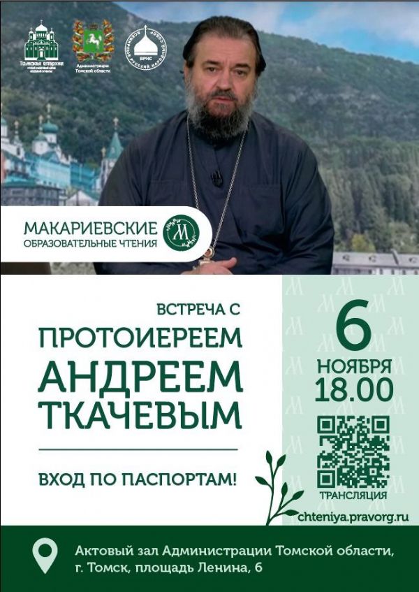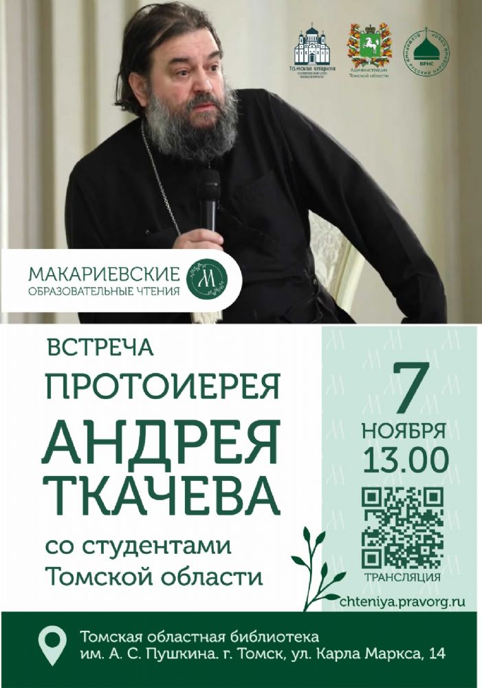 7 ноября в 13.00 протоиерей Андрей Ткачёв встретится со студентами Томской области в конференц-зале Областной библиотеки им. Пушкина, ул. Карла Маркса, 14а.