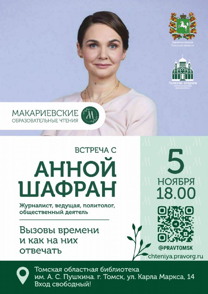 5 ноября в 18.00 томичи смогут встретиться с руководителем Дирекции аналитических радиопрограмм медиахолдинга «Звезда», ведущей телеканала «Спас», членом Комитета по проблемам защиты традиционных российских духовно-нравственных ценностей НЭС (научно-экспертного совета) Совета безопасности РФ Анной Шафран. Встреча на тему «Вызовы времени и как на них отвечать» состоится в Областной библиотеке им. А.С. Пушкина. Вход свободный!
