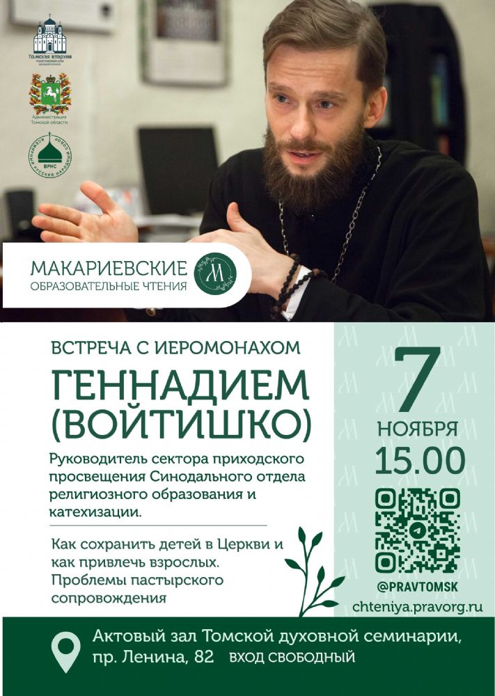7 ноября в 15.00 руководитель сектора приходского просвещения Синодального отдела религиозного образования и катехизации иеромонах Геннадий (Войтишко) расскажет, как сохранить детей в Церкви и как привлечь взрослых. Место встречи: актовый зал Томской духовной семинарии, пр. Ленина, 82