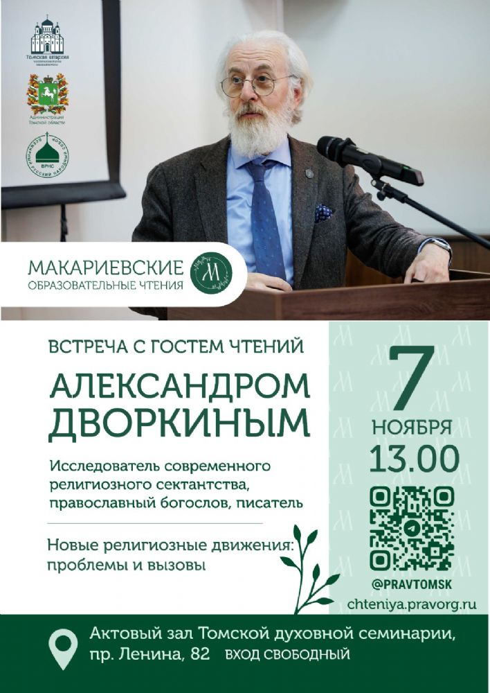 7 ноября в 13.00 в актовом зале Томской духовной семинарии выступит известный российский исследователь современного религиозного сектантства, православный богослов Александр Дворкин. Тема выступления: «Новые религиозные движения: проблемы и вызовы». Также в эти дни состоится ряд других мероприятий и встреч.