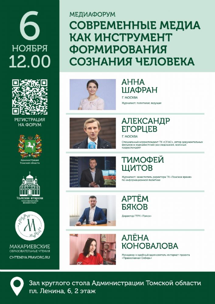 6 ноября в 12.00 в зале круглого стола Администрации Томской области с участием Анны Шафран состоится медиафорум «Современные медиа как инструмент формирования сознания человека». Спикеры форума: известные журналисты, блогеры и общественные деятели. Приглашаем журналистов! Необходима регистрация!