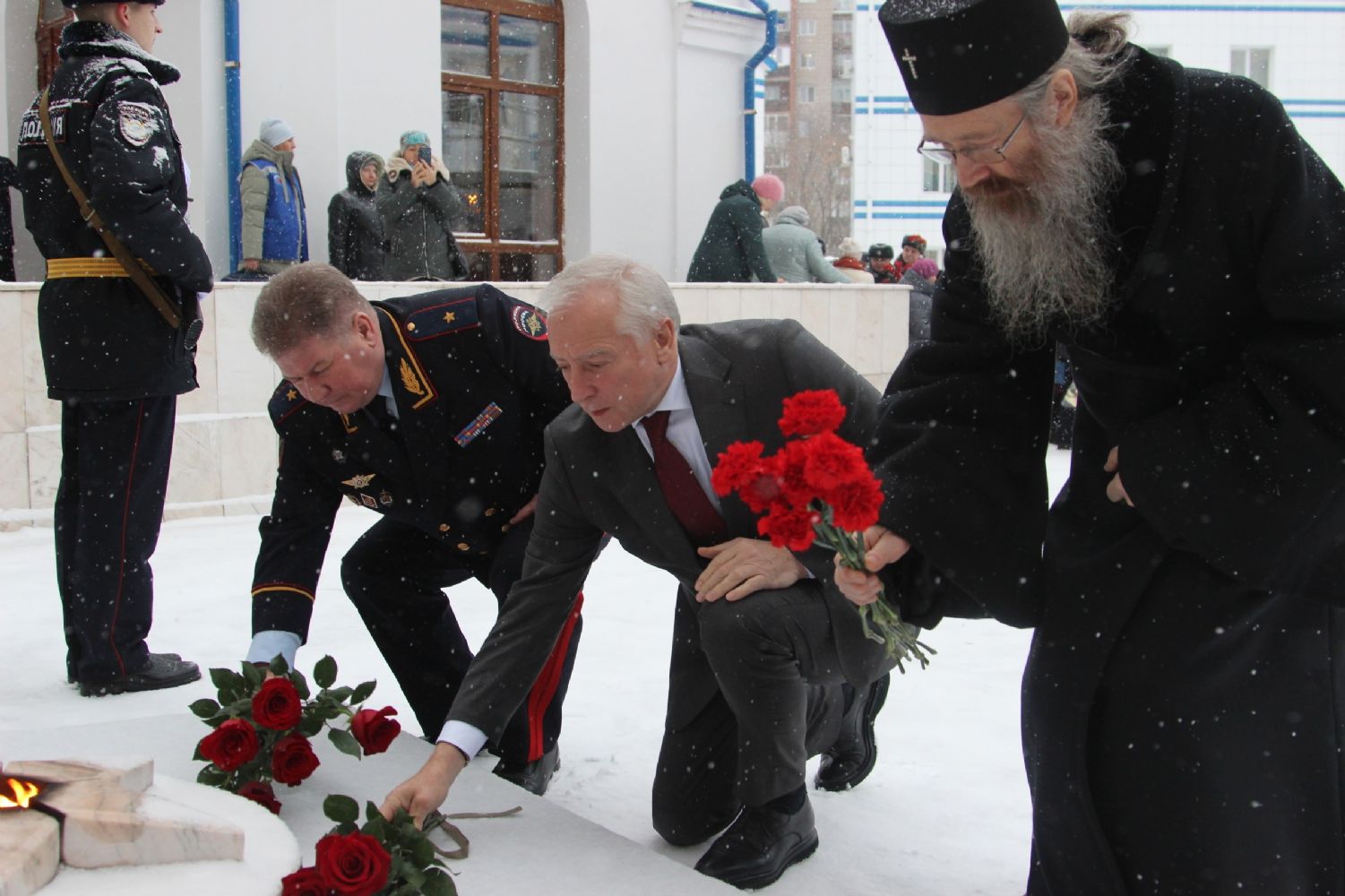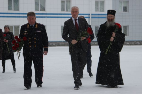 Дети, вдовы и матери погибших сотрудников вместе с Губернатором Томской области, митрополитом Ростиславом и руководителями регионального УМВД возложили цветы к Мемориалу памяти погибших сотрудников.