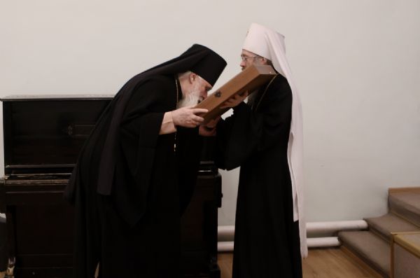 Митрополит Ростислав поздравил ректора семинарии архимандрита Иосифа с 60-летним юбилеем и подарил икону Пресвятой Богородицы "Достойно есть" (Милующая).