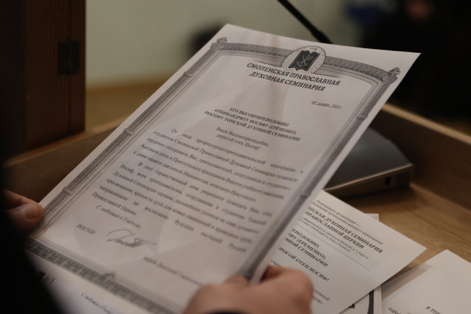 В завершение торжественного собрания проректор по учебной работе иерей Константин Хиров поблагодарил всех участников и огласил поздравительные адреса, поступившие в адрес семинарии от духовных школ Русской Православной Церкви. В них отмечались высокий уровень подготовки студентов и значительный вклад Томской духовной семинарии в развитие богословского образования в Сибири.