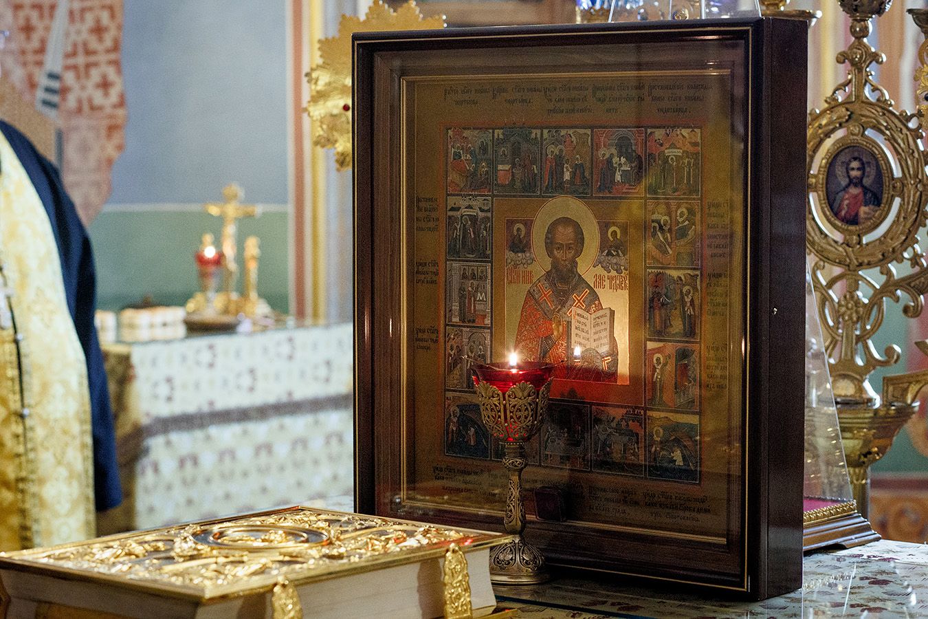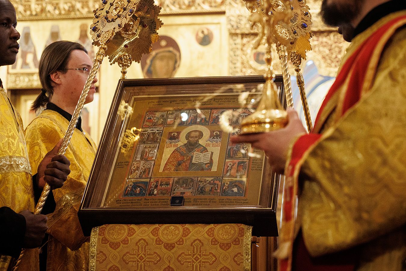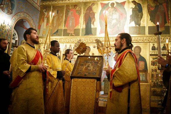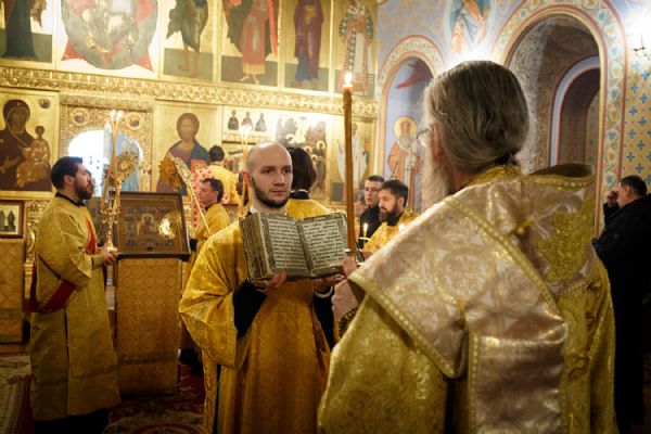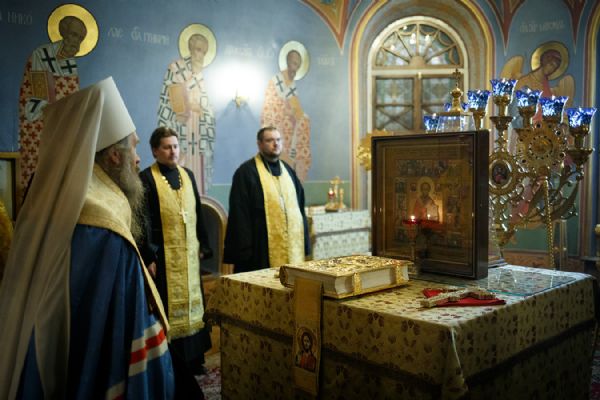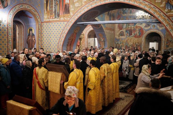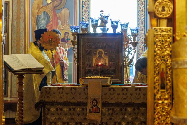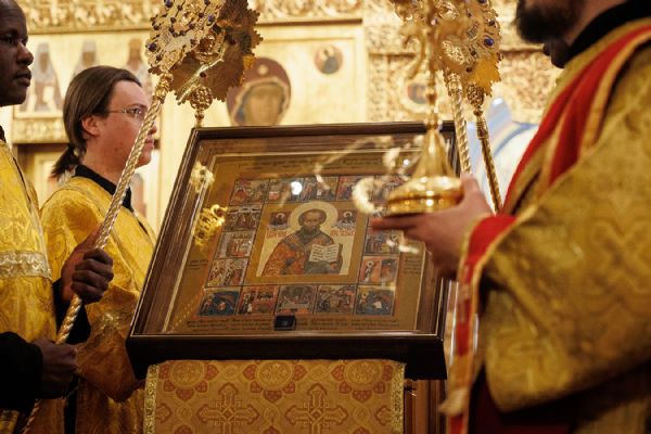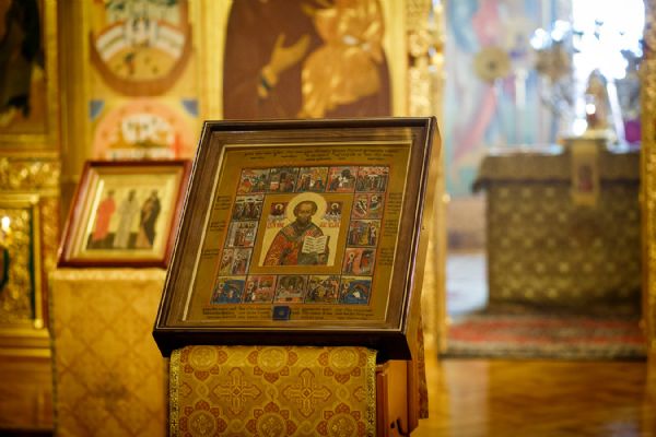 По окончании чтения шестопсалмия старинная икона святителя с клеймами была вынесена из алтаря Богоявленского собора. Перед святыней был прочитан акафист и совершено полиелейное богослужение. Каждый молящийся смог приложиться к иконе.