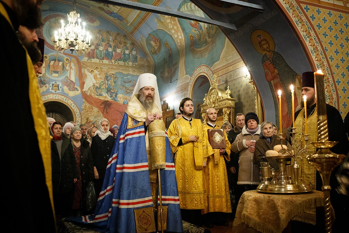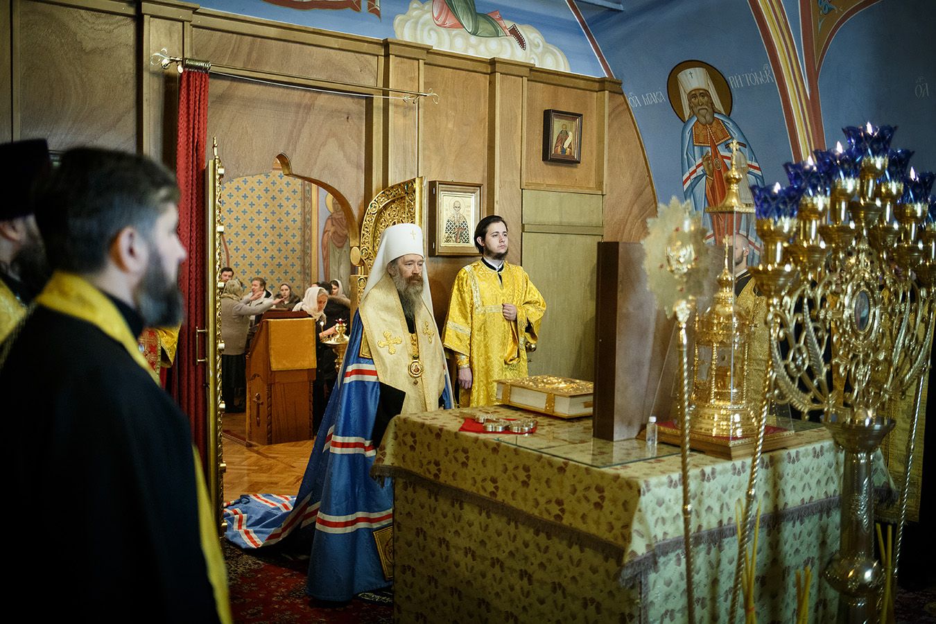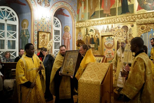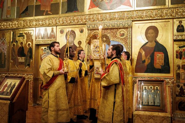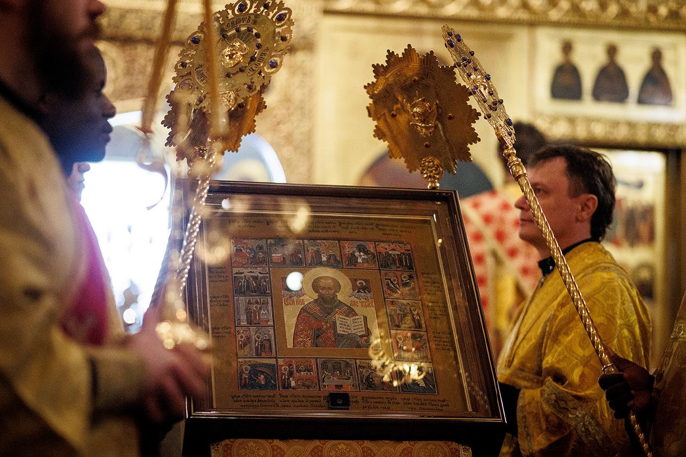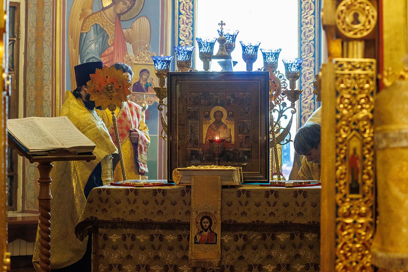 По окончании чтения шестопсалмия старинная икона святителя с клеймами была вынесена из алтаря Богоявленского собора. Перед святыней был прочитан акафист и совершено полиелейное богослужение. Каждый молящийся смог приложиться к иконе.