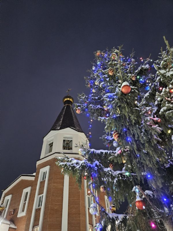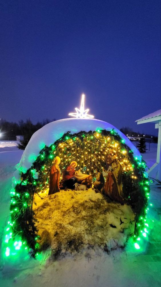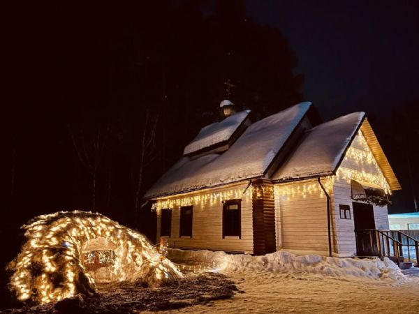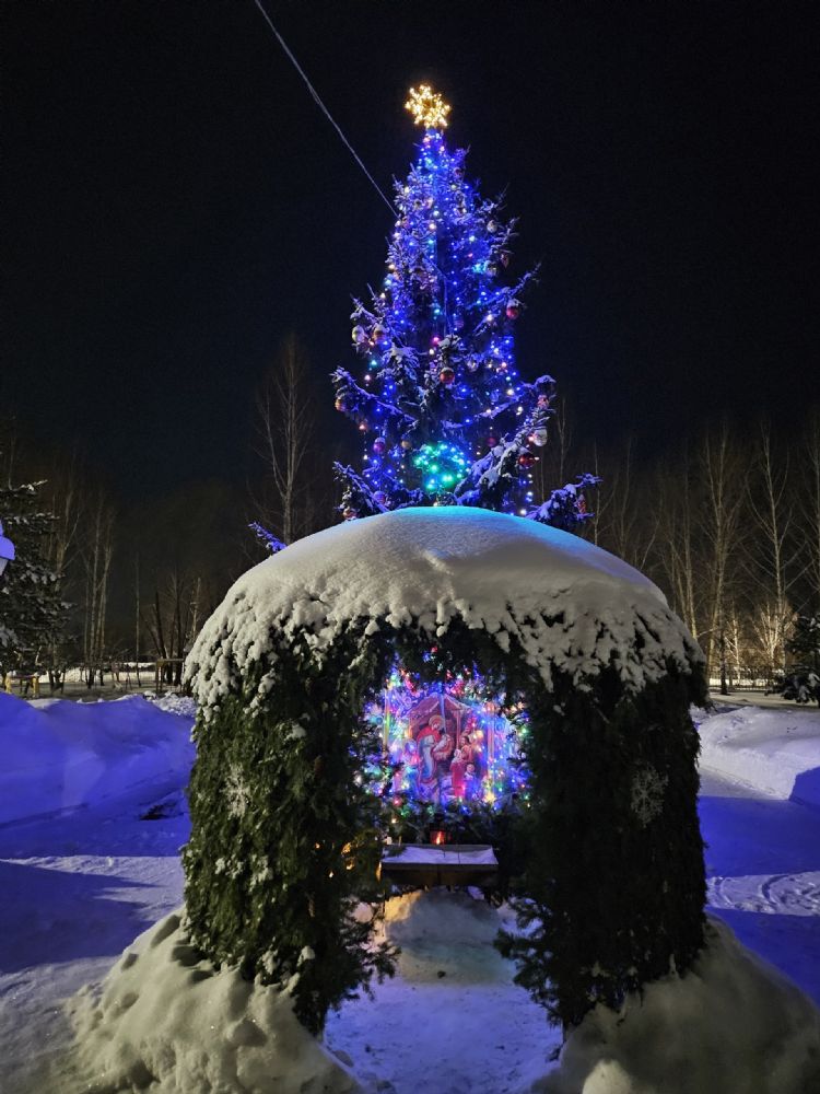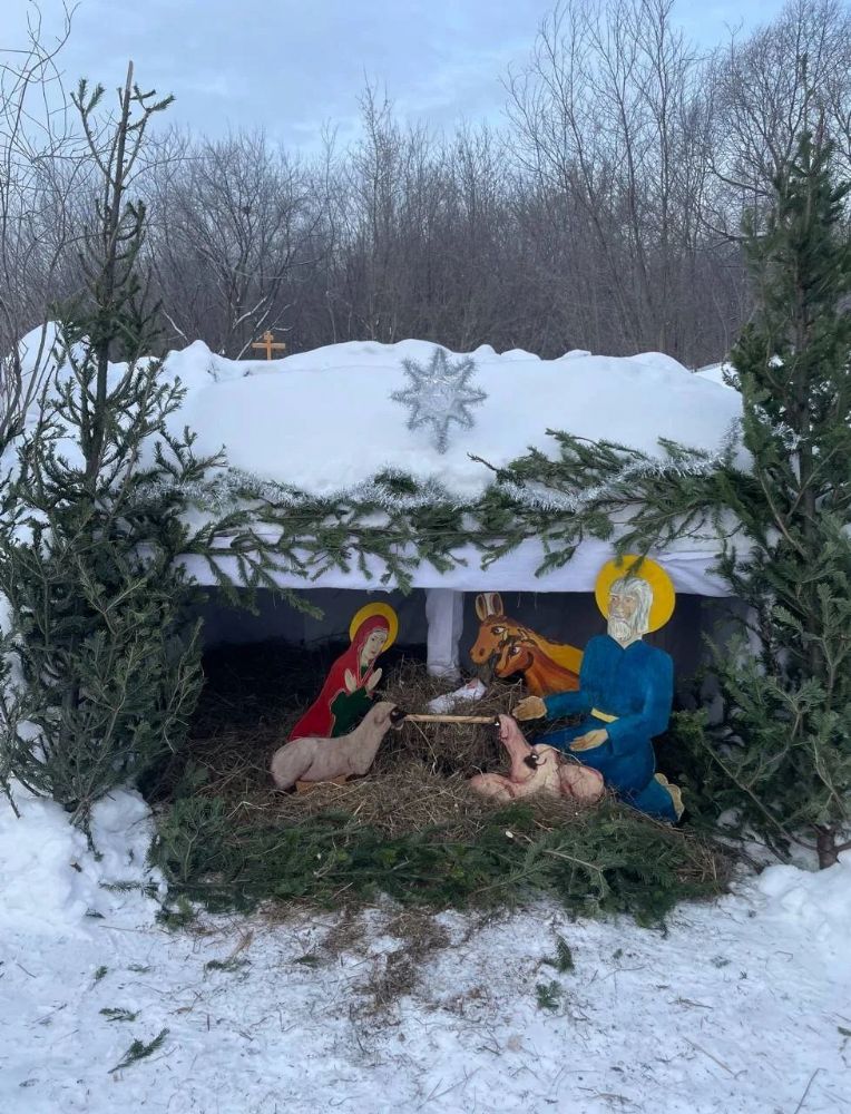 Во дворе храмов появились вертепы, украшенные гирляндами, вифлеемской звездой, ветками пихты.