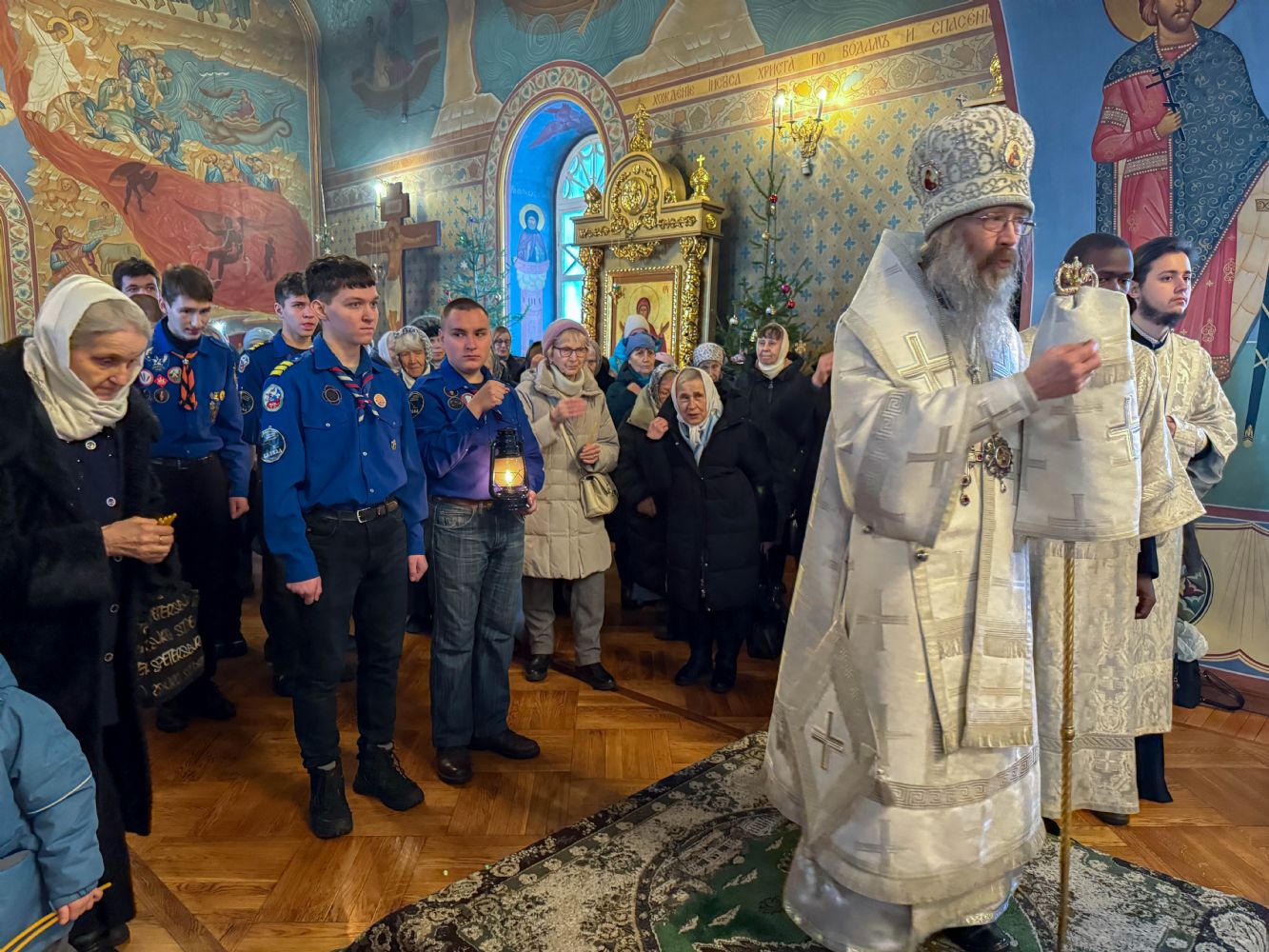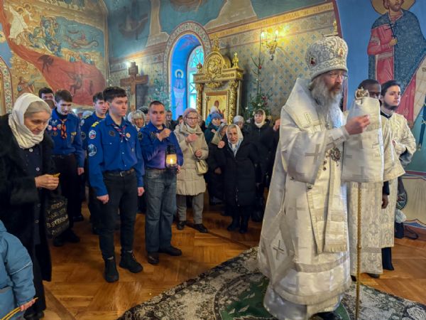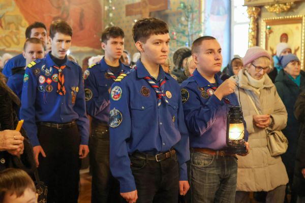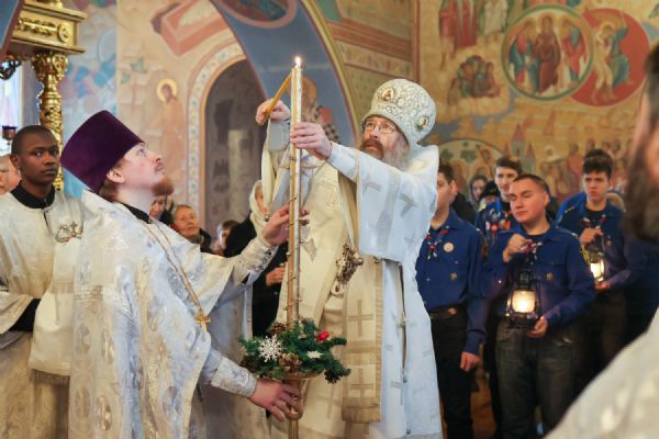 В собор прибыл отряд православных следопытов, которые доставили в храм лампаду с Вифлеемским огнем, зажженным от светильника, неугасимо горящего в храме Рождества Христова в Вифлееме, на месте рождения Спасителя. Именно от этого огня в центре собора была зажжена свеча, символизирующая Вифлеемскую звезду, после чего духовенство, семинаристы и все собравшиеся пропели тропарь Рождеству Христову.