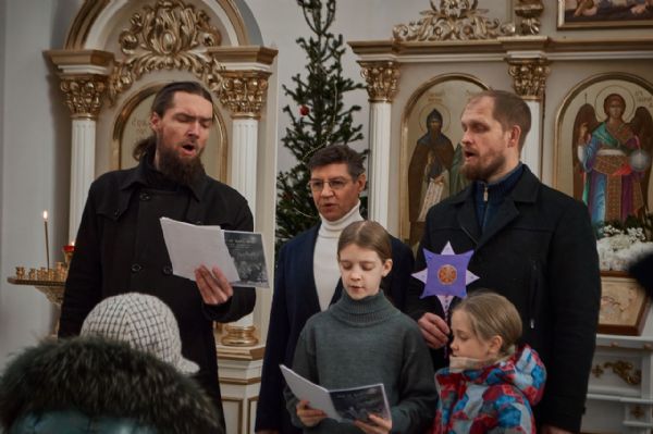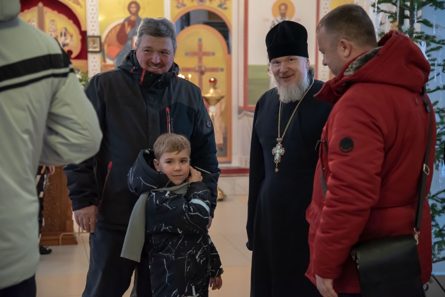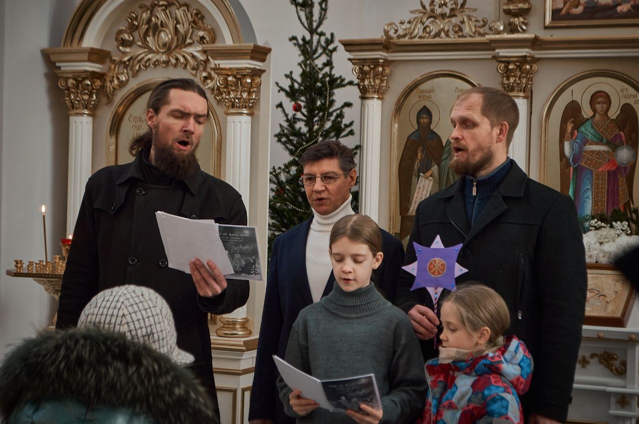 Гости подпевали колядки вместе с певчими Мужского хора, настоятелем храма иереем Евгением Растяпиным, настоятелем Воскресенской церкви иереем Дионисием Мелентьевым и настоятелем Покровской церкви с. Петухово иереем Сергием Шитиковым.