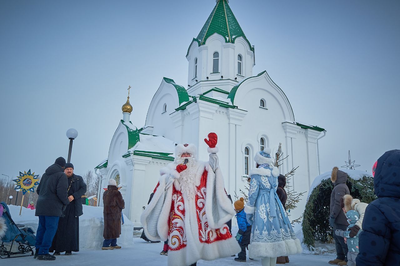 Настоятель храма иерей Алексей Коновалов обратился к собравшимся с тёплыми словами, подчеркнув значение праздника Рождества Христова. А герои русских сказок- Богатырь с Забавой и Мишка закружили детей в весёлом хороводе, подвижных играх и танцах.