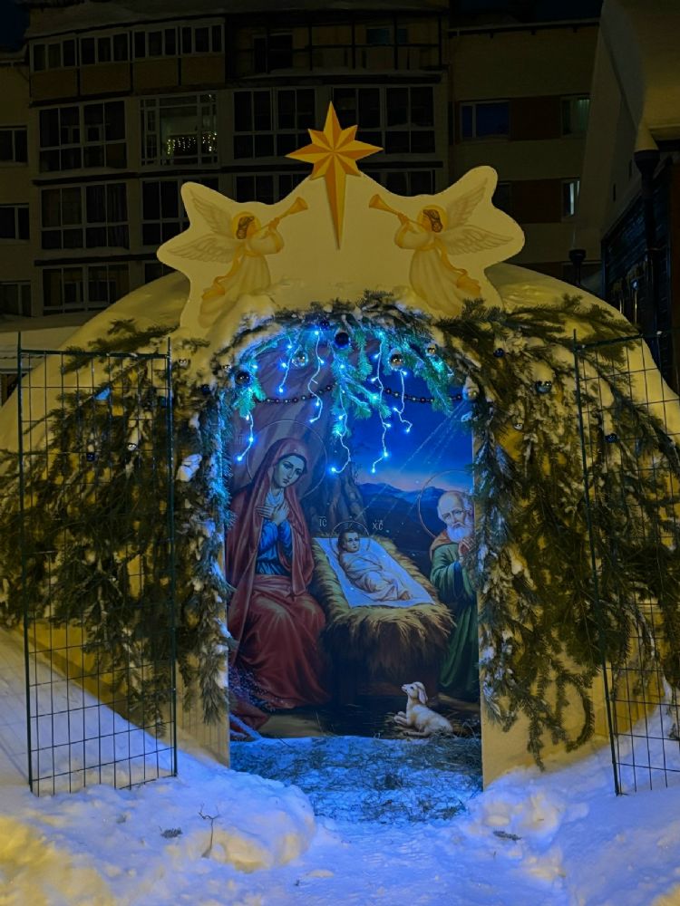 Впервые в этом году снежный рождественский вертеп появился у новоосвященного храма святой мученицы Татианы в мкр-не Левобережный. Вертеп изготовлен силами прихода и ГК "Карьеоруправление".