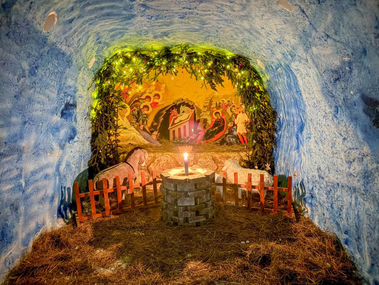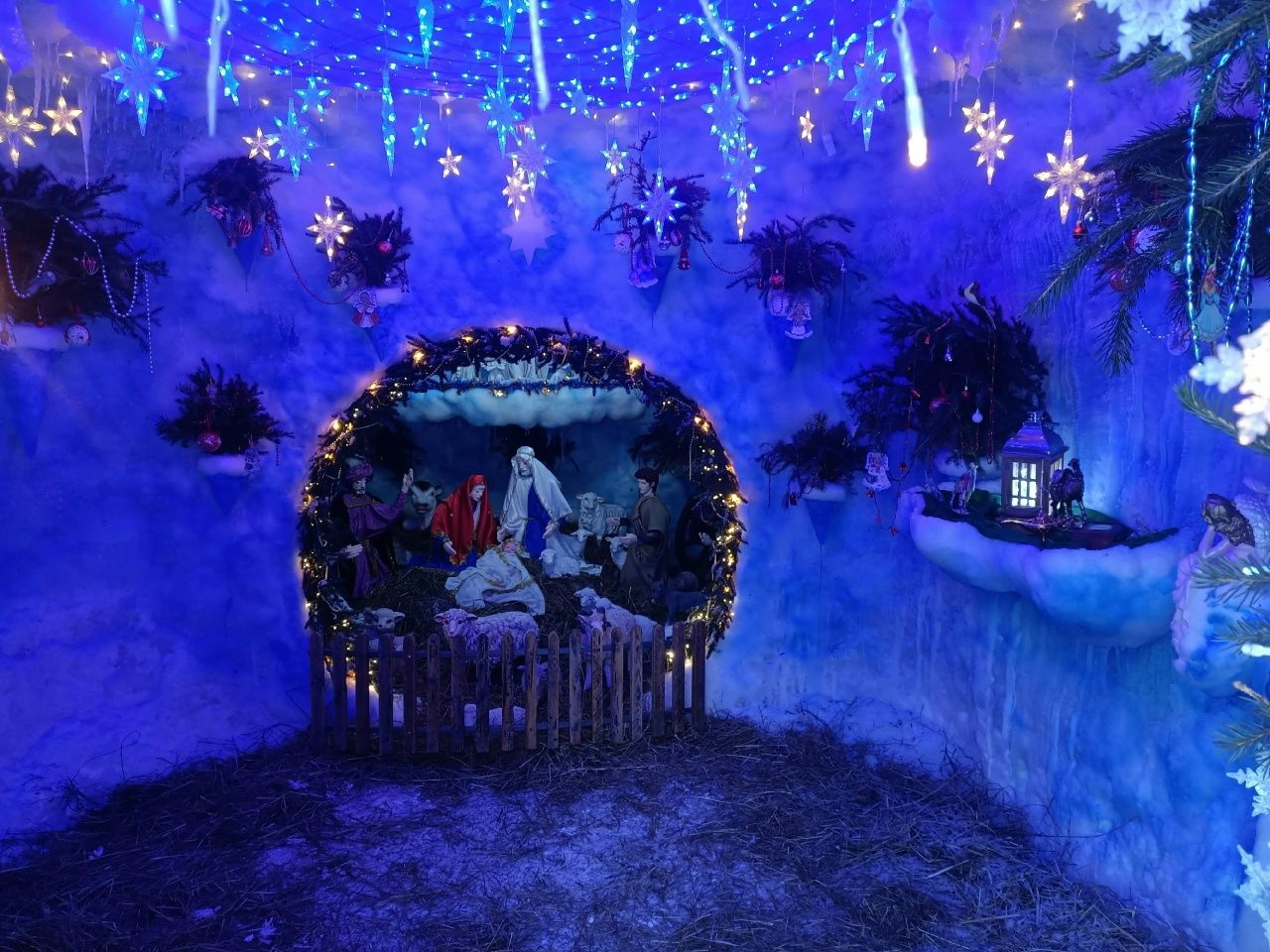 Удивительный вертеп создан руками прихожанки Марины Волковой из Спасского храма с. Коларово (Спасское). Дева Мария, Иосиф Обручник, волхвы с дарами, пастухи, милые барашки и, конечно, Богомладенец в яслях. Продумана каждая деталь, всё сделано вручную: фигурки из бумажного теста, барашки из искусственного меха, теста, ослик, вол и верблюд — из фольги и льна.