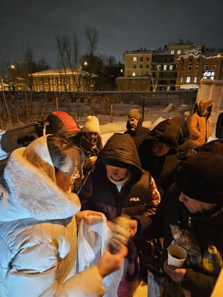 7 и 8 января прихожане и социальные работники Владимирского храма поздравили с праздником подопечных прихода. Во время кормления бездомных они раздали сладкие подарки, пряники, фрукты, а также рукавицы, шерстяные носки, колготки и другие теплые вещи.