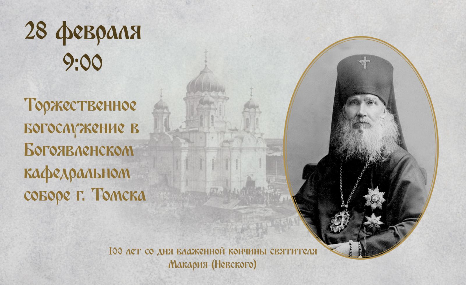 В субботу, 28 февраля, накануне 100-летия преставления святителя Макария (Невского), в Богоявленском кафедральном соборе г. Томска будет совершена праздничная Божественная литургия с участием духовенства Томской митрополии. Богослужение возглавит митрополит Томский и Асиновский Ростислав.