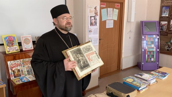 Во время посещения гимназии отец Святослав совместно с педагогами провел библиотечный урок, открыл школьную выставку православных книг. На выставке представлены книги из библиотечного фонда этого учебного заведения общего среднего образования с углублённым изучением предметов гуманитарного цикла, а также книги Свято-Троицкого храма.