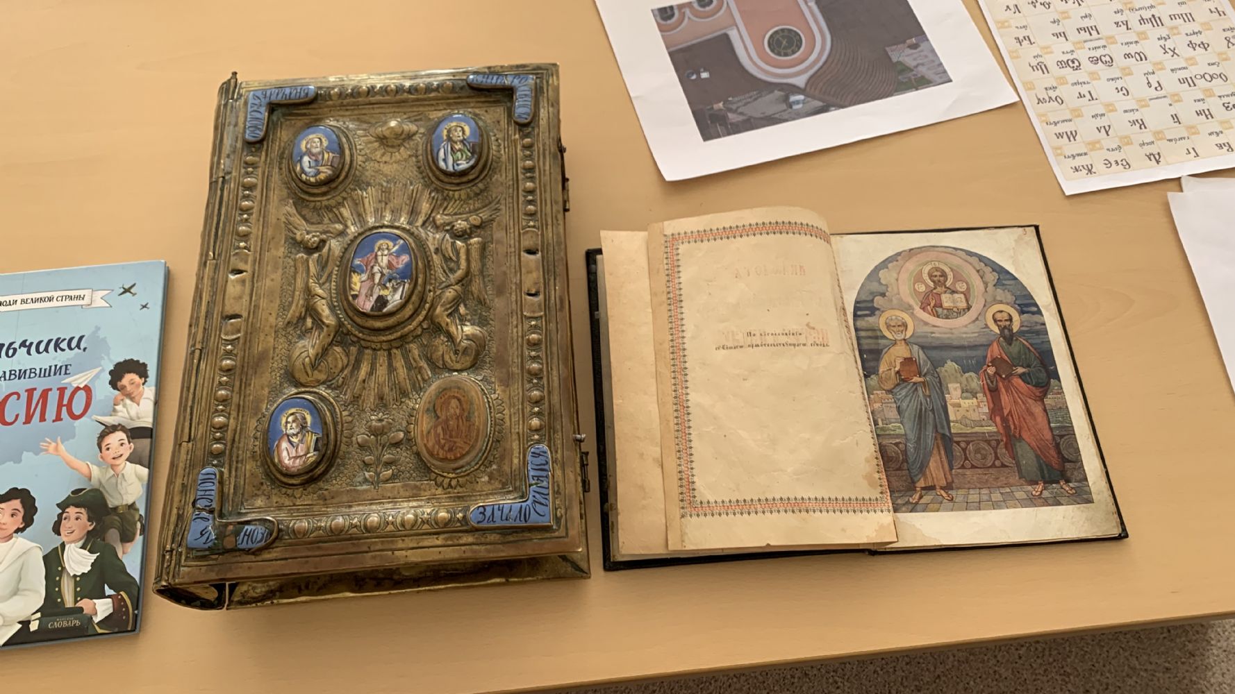 Особый интерес ребят вызвало Евангелие, изданное в 18 веке, в тяжелом окладе, украшенном металлическими накладками с изображением святых. Ребята полистали книги, рассмотрели буквицу, особенности шрифта и систему сокращения слов в богослужебных книгах, написанных на церковнославянском языке.