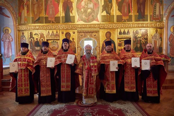 За многолетнее усердное служение Церкви Христовой митрополит Ростислав вручил архиерейские награды священнослужителям Томской епархии.